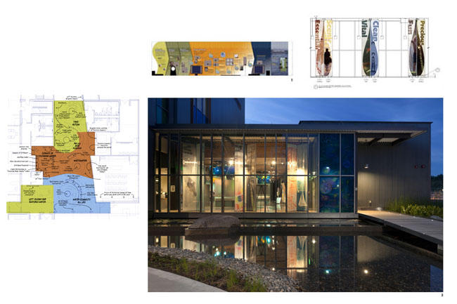 The pinnacle of this concept is the reclaimed water pond, a physical manifestation of LOTT's vision to elevate the concept of reclaimed water in the community. The water feature engages visitors as they walk over one of two bridges that span the pond in order to enter the building. Once visitors are inside, the pond continues to be a primary design element, as it is visible from both the offices and the interpretive center. The water feature also provides a pleasant auditory connection when employees take advantage of the operable windows in the adjacent offices. The pond's perimeter is surrounded by multiple interpretive exhibits that explain the pond and reclaimed water.