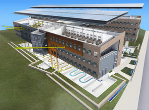 The pre-design and concept design phase of the project began with a national design competition that was part of DOE’s innovative performance-based procurement method. The delivery team started the four-month competition phase with a multi-day design charrette involving all the integrated disciplines that focused on design solutions addressing the LEED Platinum requirement and the owner’s desire for a net-zero-energy building—while meeting the functional, programmatic and cost requirements of the project. The design charrette began with the development of a simple energy model to begin testing design strategies and helped the team quickly move toward a solution that was deeply passive, with a form and exterior envelope that was responsive to the climate, used water-based radiant heating and cooling systems, and decoupled the ventilation air from space conditioning. The resulting design concept proved to be highly integrated and changed little from what was ultimately constructed.