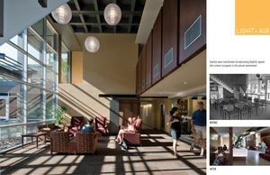 The design also takes a “big picture” approach to sustainable design through its approach to campus and biophilic design. First, the design team reconsidered the planning concept approved by the university and recommended an alternative concept that reduced program by 12% and project footprint by 20%, preserving 5,000 square feet of green space for wellness programming. Second, from material selection, access to daylight, and the use of programmed landscape space, the design reinforces the relationship between occupants and the natural environment. The project’s biophilic design significantly contributes to the owner’s primary goal of deinstitutionalizing the facility and fostering a sense of health and wellness within a welcoming environment that would change the students’ perception of a “health clinic” and encourage the adoption of “healthy lifestyles.”