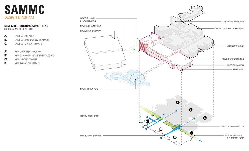 SAMMC was one of the first major medical projects procured by the Department of Defense (DoD) under an Integrated Design-Bid-Build (IDBB) approach, which included early collaboration between the design team and the contractor and leveraged early use of BIM modeling and energy analysis. This process facilitated quicker evaluation and testing of building systems and sustainable design strategies. As a result of SAMMC’s success during design and development, the DoD has moved towards using full Design/Build procurement strategies on other medical projects to foster even greater designer and contractor collaboration.