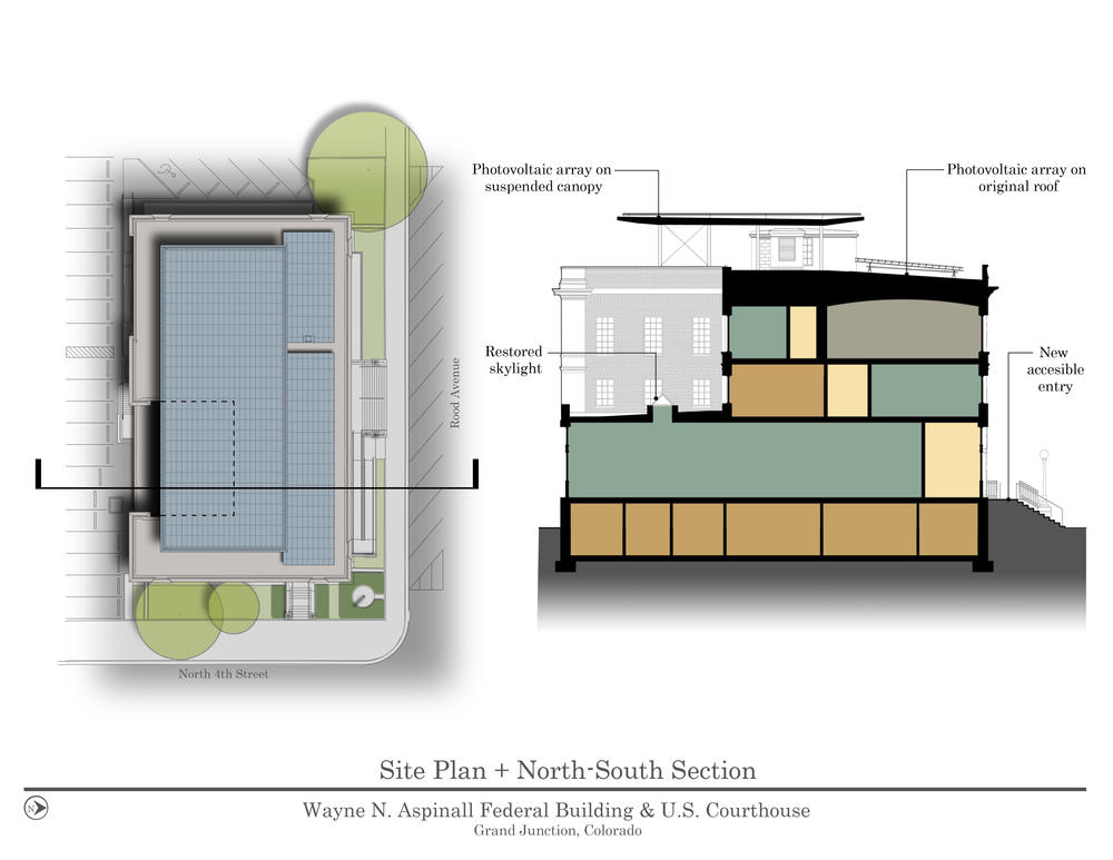 The Aspinall U.S. Courthouse modernization/high-performing green building renovation preserves an anchor in Grand Junction, and converts the 1918 landmark into one of the most energy efficient, sustainable historic buildings in the country. Funded by the American Recovery and Reinvestment Act, the $15 million project aims to be GSA’s first net-zero energy facility on the National Register. The project has achieved LEED® Platinum certification, and scores in the top 2% of LEED-NC v2009 projects on the U.S. Green Building Council's Green Building Information Gateway (GBIG).