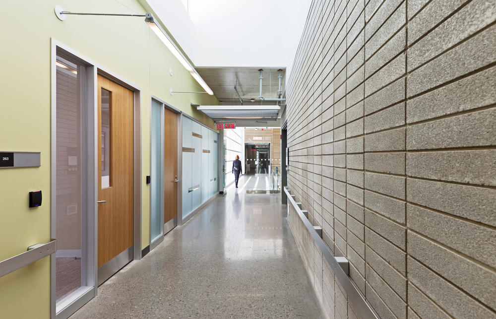 The IDP team targeted a 50-year durable building plan against which all material selections and maintenance plans were evaluated. External material selections for zinc and glass fiber cement panels are products with long-term performance. The interior is designed to be tough and robust with polished concrete floors, concrete block walls, detailed to advantage in all public areas, and exposed concrete ceilings. Building envelope design consulting services and field reviews were implemented and a durability plan was developed.
