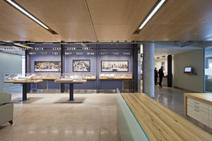 Materials are also used to tell part of CANMET’s story. The lab’s focus on steel and its alloys is a springboard to showcase metal craft and design. Accent tiles in the lobby are made from recycled pop cans, while others are printed with nano-scale images from NRCan’s electron microscopes.