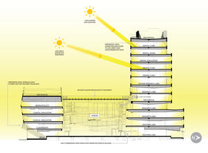The main mechanical floor of the building was centrally located mid-way up the north tower to minimize the size of building systems' runs. This decision also allows for the building’s innovative air handling units to double as a smoke evacuation system in the atrium.