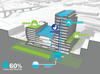 The building's enhanced mechanical systems also play a big role in energy savings. This system focuses on high indoor air quality and energy efficiency with an air recovery system in the atrium that captures heat and reuses it elsewhere in the building.