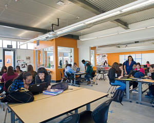 As part of the integrated design approach, the owner's representative advised the design-build team on lessons learned from existing schools and encouraged best practices gleaned from learning environments around the world. The project incorporates least-toxic materials not only in the construction elements but also in the instructional equipment (for example, through a ban on mercury-containing devices) and the custodial program (for example, through elimination of heavy-metal floor finishes). Identifying least-toxic alternatives for integrated pest management, housekeeping, groundskeeping, and ongoing maintenance ensures a healthier environment for staff, students, and visitors.
