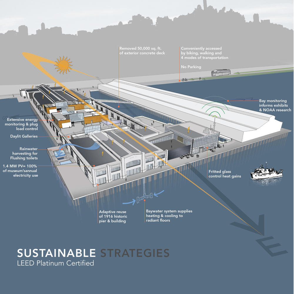 The new location has excellent connectivity to the city and includes no parking for the more than 1,000,000 visitors a year. A major new public plaza filled with exhibits and event space replaces the former parking deck between the two piers. It brings public life and energy to a formerly blank stretch of the waterfront. The design takes advantage of the original pier building’s original clerestories for daylighting, 800’ long roof for PVs, and uses the water below for baywater radiant cooling.