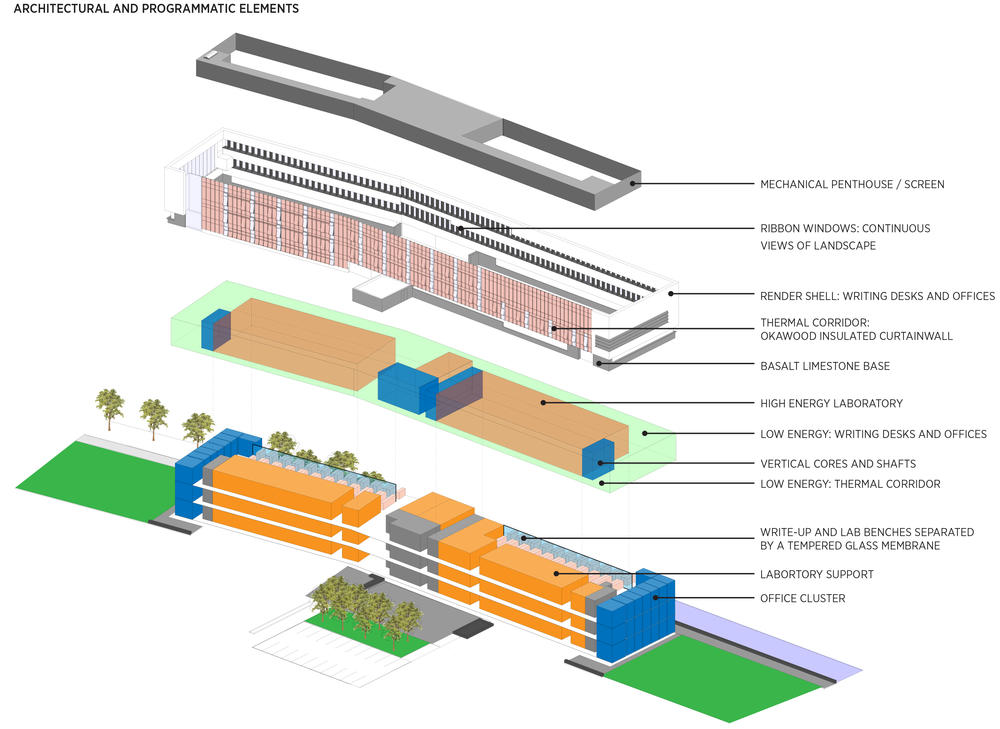 The building was designed above known flood levels and is future-proofed in the event of flooding in the region, with no occupied space below grade. The surround of operable windows, a rarity in laboratories, is a fundamental element for resiliency planning.