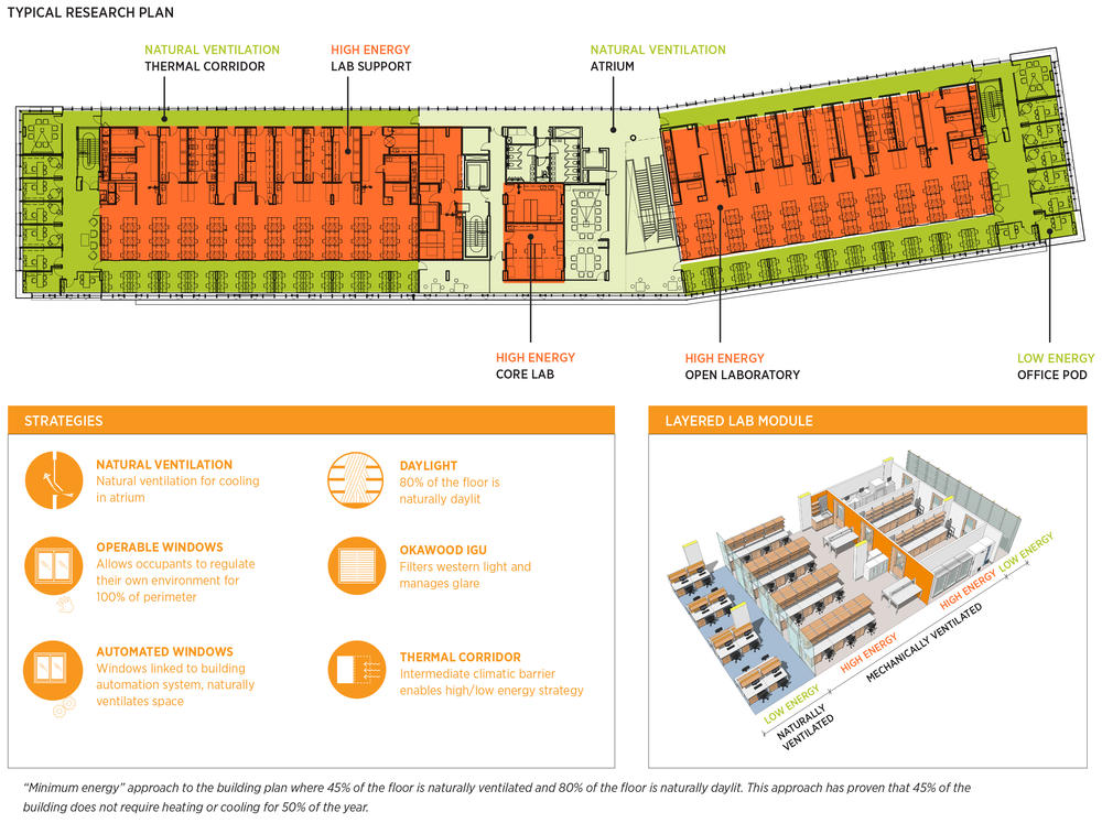 Natural ventilation is fundamental to the building. 45% of the floor area is naturally ventilated and supplemented with radiant heat when needed. High operable windows are controlled by the building automation system to maintain comfortable temperatures and minimum ventilation, while lower casement windows are controlled by the occupants to allow adjustment to meet individual comfort needs. Almost all laboratory buildings of similar programmatic complexity in similar climate zones located in the United States have no natural ventilation.