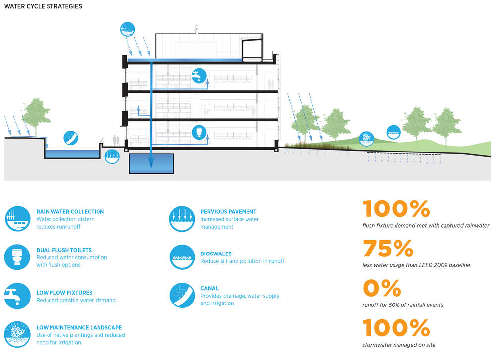 In addition, the BRB captures rainwater off the building roof for the flush fixture and other building uses, meeting 100% of the flush fixture demand. Coupled with dual-flush toilets and low flow fixtures, the building uses 75% less water than the LEED 2009 baseline (annual savings is equivalent to 9,700 bathtubs of water). A low maintenance landscape was designed to require no irrigation, further minimizing the building’s demand on potable water supplies.