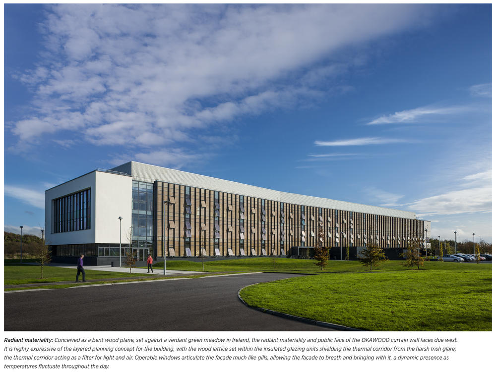 The BRB is a prototypical project that minimizes the environmental impact of materials, maximizes building performance and optimizes the occupant comfort. For example, the precast concrete superstructure contains the 30% Ground Granulated Blast-Furnace Slag resulting in the saving of 3,221 gigajoules of embodied energy. The superstructure was also pre-fabricated off-site to reduce the carbon footprint and minimize construction waste. Finishes were selected to minimize the amount of energy/pollution required to manufacture, ship to site and erect. The basalt stone, steamed beech millwork, exterior and stucco and curtainwall were all locally sourced. The façade systems were designed to achieve a U-value of 0.32 for glazing and a R-value of 28 for the walls. This enabled the spaces on the perimeter to rely solely on operable windows and natural ventilation for cooling without the need for air conditioning. The alternating array of clear and OKAWOOD vision glass provides a warm materiality and controlled, textured light through the corridor and into the adjacent laboratory spaces. The result is a building that minimizes the impact of its materials on the environment, while creating a material palate that embraces the Irish climate and views of the surrounding landscape.