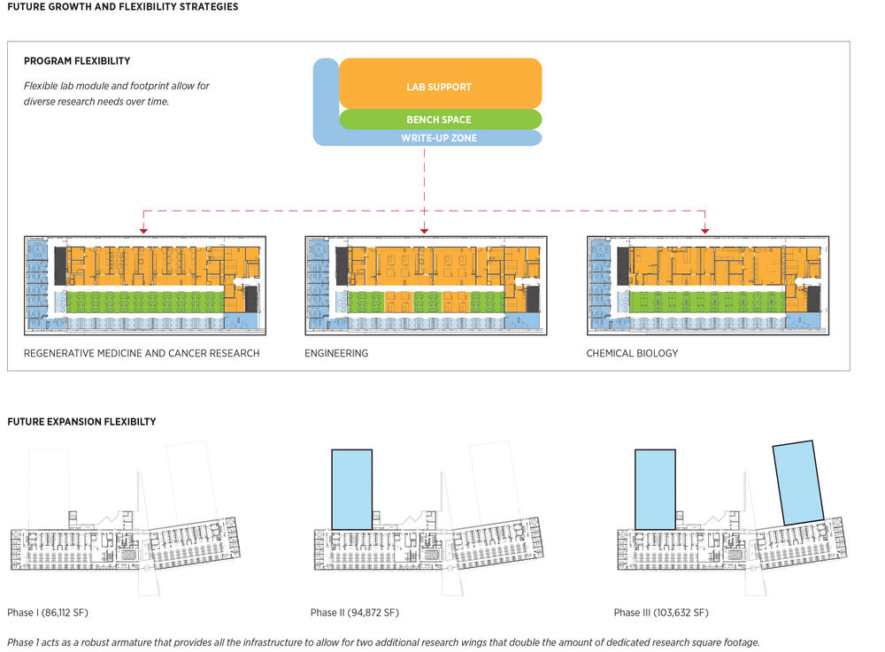 Finally, the planning module is conceived to accommodate a range of research needs. Floor plates, partitions and modular laboratory casework systems can be adapted and reconfigured to meet future needs. The culmination of these strategies creates a 100+ year building that forms the cornerstone of the new research precinct.