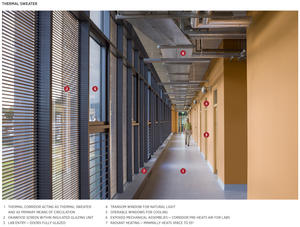 While research buildings are typically internally load-driven buildings, the integration of a sun control strategy that was tuned to each orientation was an important component to control solar gain given the desire to eliminate mechanical cooling from the low-load perimeter spaces. There was careful detailing for a tight thermal envelope (R-value 28) to impede heat loss in the cooler months in order to minimize the need for supplemental heating. To deal with the long western façade of the building, a “thermal corridor” acts as a buffer, or “sweater,” between the interior and exterior. The thermal sweater was allowed to have an expanded temperature range (55° – 85°) to mediate between the closely controlled thermal environment of the lab and the exterior. The wooden slats integrated into the curtainwall create more filtered light and reduce glare, a chronic condition at this latitude.