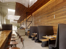 This collaboration was particularly fruitful in the design and fabrication of the sinuous concrete banquettes formed of ductal concrete, an "ultra-high-performance concrete" which only recently has been developed as an aesthetic architectural building material. Concreteworks, a local artisanal concrete fabricator, worked closely with the architect to develop the ductal banquettes, host stand, and guardrails. Having used ductal once before, Concreteworks brought both their knowledge of the product and desire for innovation to the project. The collaboration resulted in the creation of light, expressive concrete pieces that provide a significant contribution to the overall design and experience of the space.
