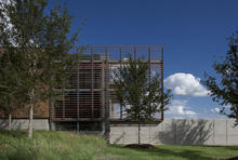 Canopy, brise soleil, and stepped footprint, south facade. San Antonio can be brutally hot and humid in summer (ASHRAE Climate Zone 2A). The addition has nearly optimal solar orientation: facing south/southeast, it turns away from the hotter western light. The deep overhangs of the umbrella and the terra cotta baguettes allow extensive glazing on selective surfaces to provide views and let in light while controlling heat. The deep indentations of the plan shade the building as the sun moves toward the west.