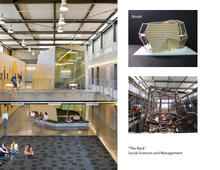 Social Sciences and Management Building - Photo Credit: UC Merced UC Merced committed to purchasing materials to local and regional materials to support the local economy and achieve LEED Platinum targets. To date, six buildings have achieved LEED Gold, with the remainder pending. As the largest concentration of LEED-certified buildings in the region, the site has become a living teaching tool for local contractors, designers and architects. On a typical Phase 1 building, exemplary performance is the norm. For Phase 1, 70% of waste was recycled or diverted from local landfills, 48% of materials were from recycled content and 43% of materials were manufactured regionally. Glass, concrete and steel composed in utilitarian forms evoke regional architectural industrial structures. Building overhangs provide a shaded pedestrian realm, with color accents along pedestrian corridors that provide views into internal active ground floor uses.